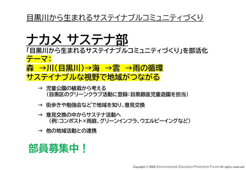 ナカメサステナ部は中目黒地域を流れる目黒川からの視点で近隣地域と連携しながらサステイナブルな活動を広げてます。