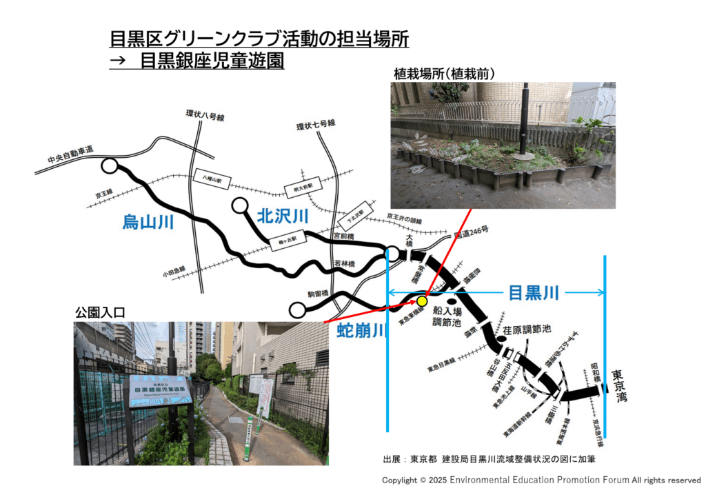 「川がテーマなのになぜ公園の植栽?」と思われるかもしれませんが、サステイナブルな視点でみると雨の循環(水の循環)でつながっています。 それから重要なのは、この児童公園が暗渠の蛇崩川横に位置している(図参照)という偶然もあり、サステナ部としては最適な場所と思います。