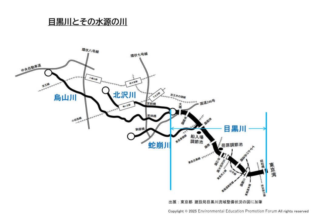 自然な状態の目黒川には北沢川(きたざわがわ)、烏山川(からすやまがわ)、蛇崩川(じゃくずれがわ)の3つの川が流れ込んでおり、この3つの川が主な水源となっています。